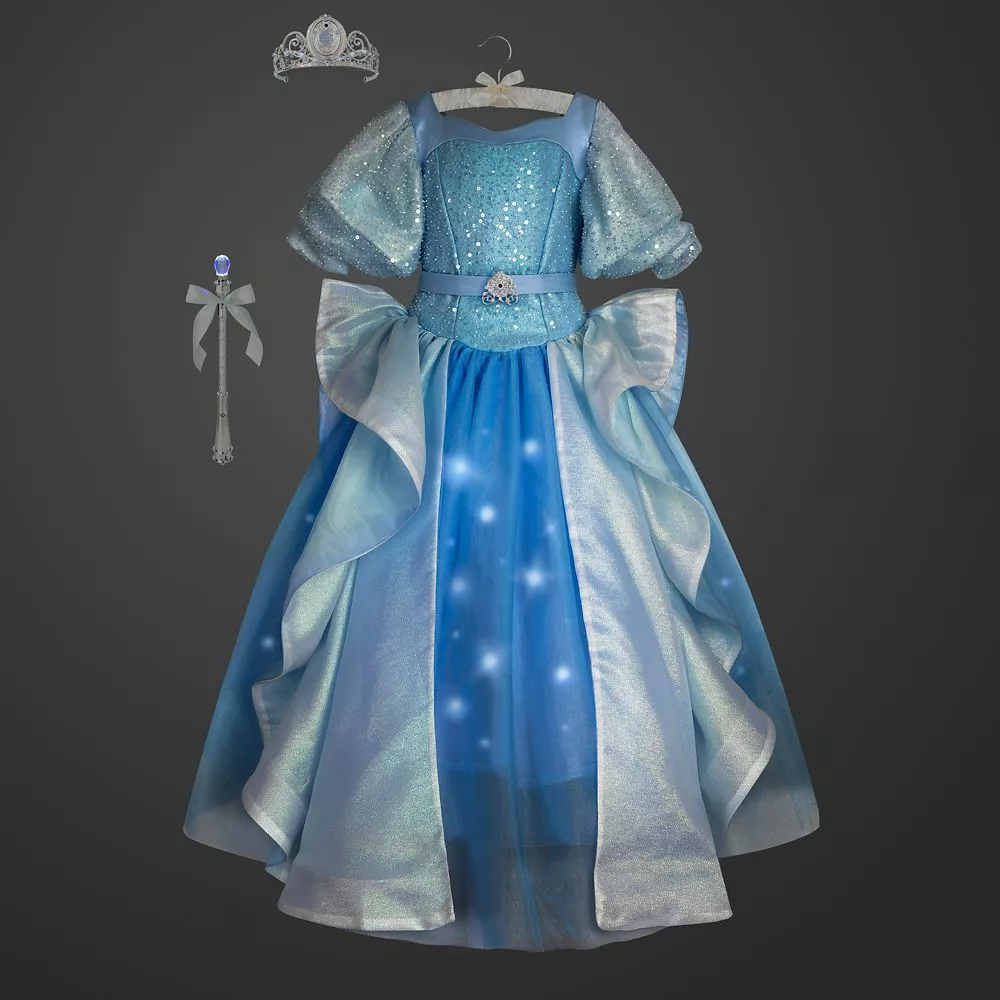 Our Disney Princess Cinderella Light-Up Costume by A Leading Role is exquisite in construction and full of sparkle! With just a wave of your wand, get ready to light up the room! Features a blue beaded and sequin bodice and puff sleeves and an iridescent organza peplum over tons of sparkling tulle. In this gown, dreams really do come true! Comes with our Light-Up Tiara and Wand Accessory Set. LED lights make the tiara and dress sparkle when activated by the wand.