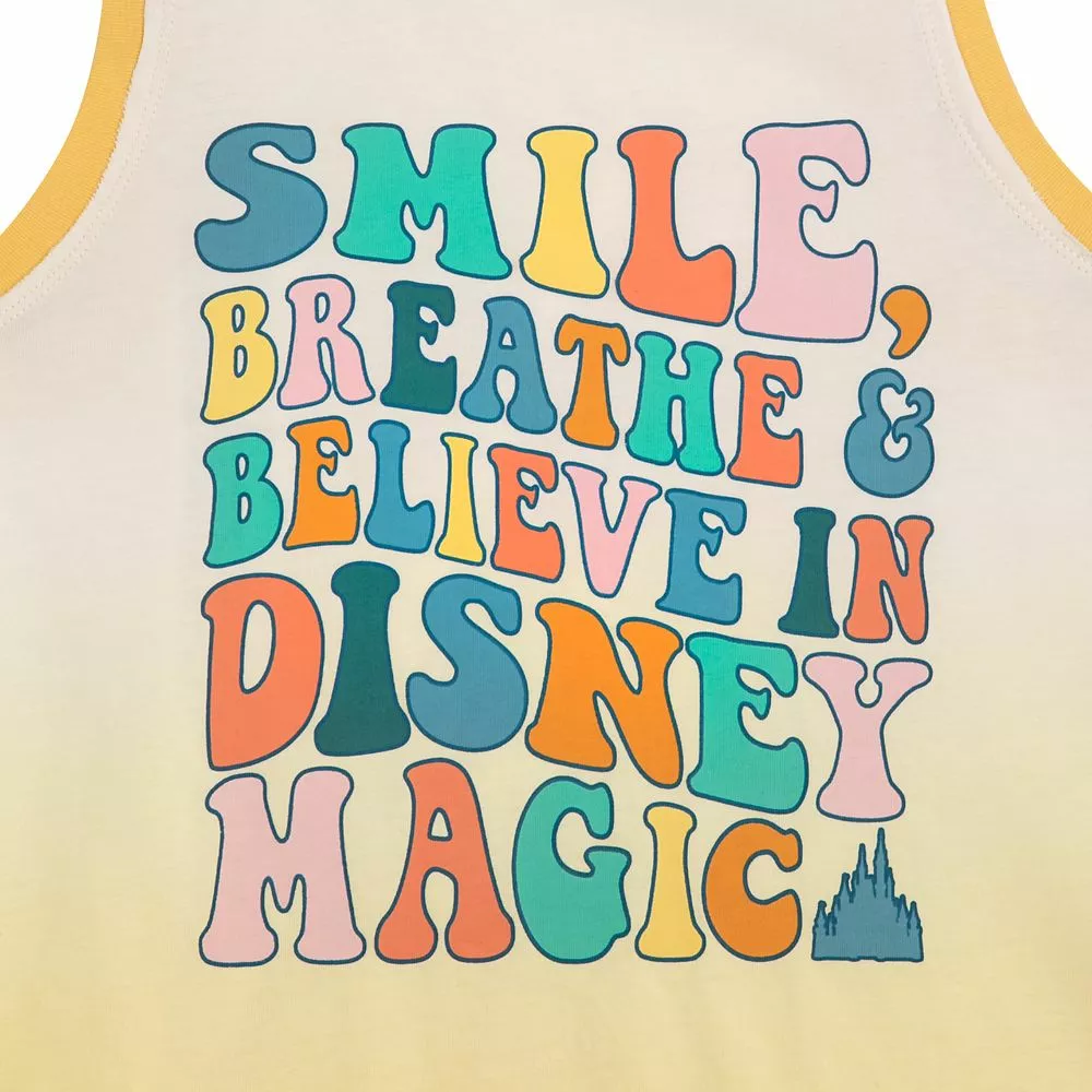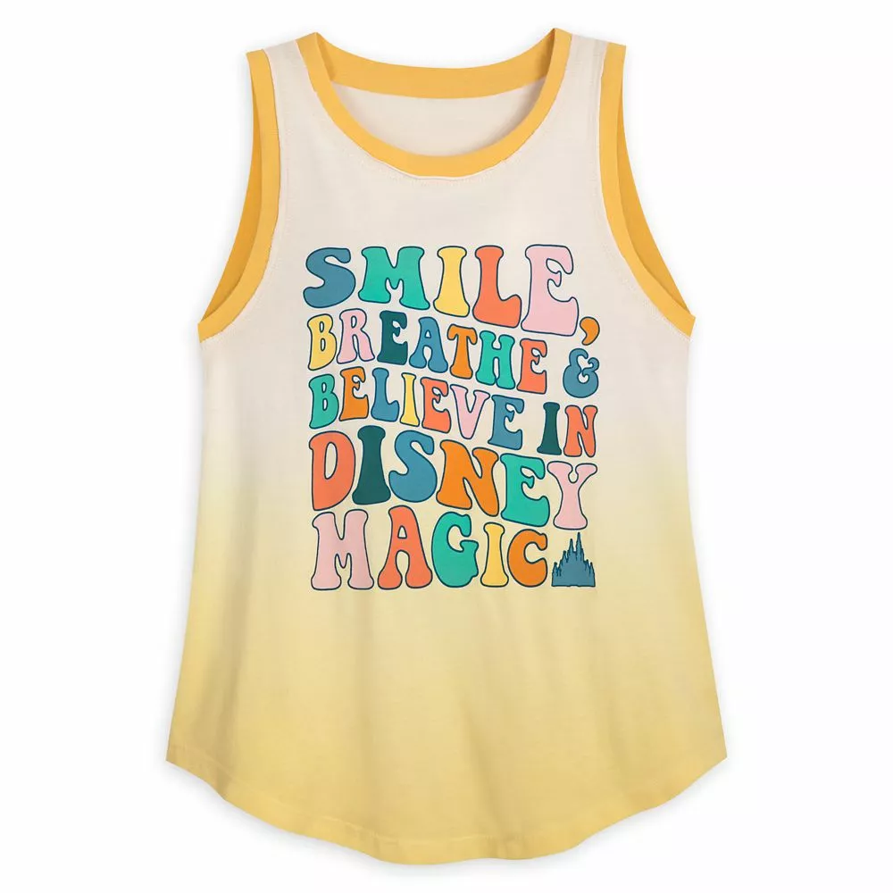 It’ll. be easy to ”Smile, breathe and believe in Disney Magic” when wearing this retro style tank top! With its Fantasyland Castle icon, dip-dye hem, contrast rims and raw-edge accents, it’s transformative!