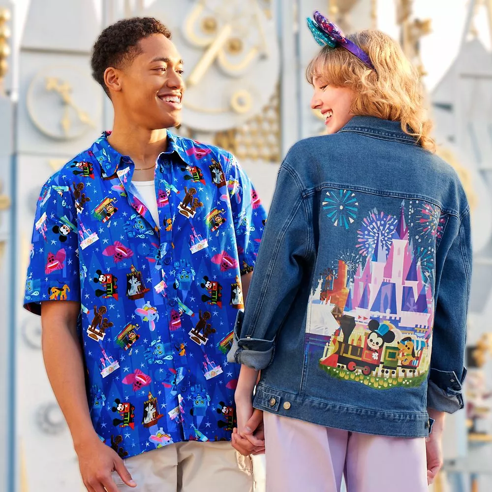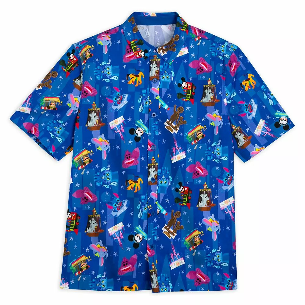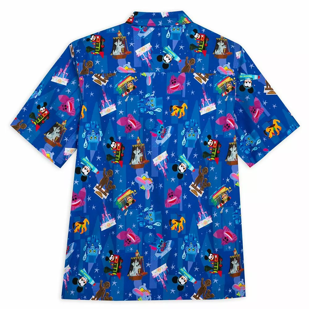 Your eyes will enjoy a fun trip around the Disney Parks every time you wear this colorful woven shirt. The allover print was designed by artist Joey Chou and features favorite characters, landmarks and attractions including the Hatbox Ghost, Cheshire Cat and the Prison Dog from The Pirates of the Caribbean.