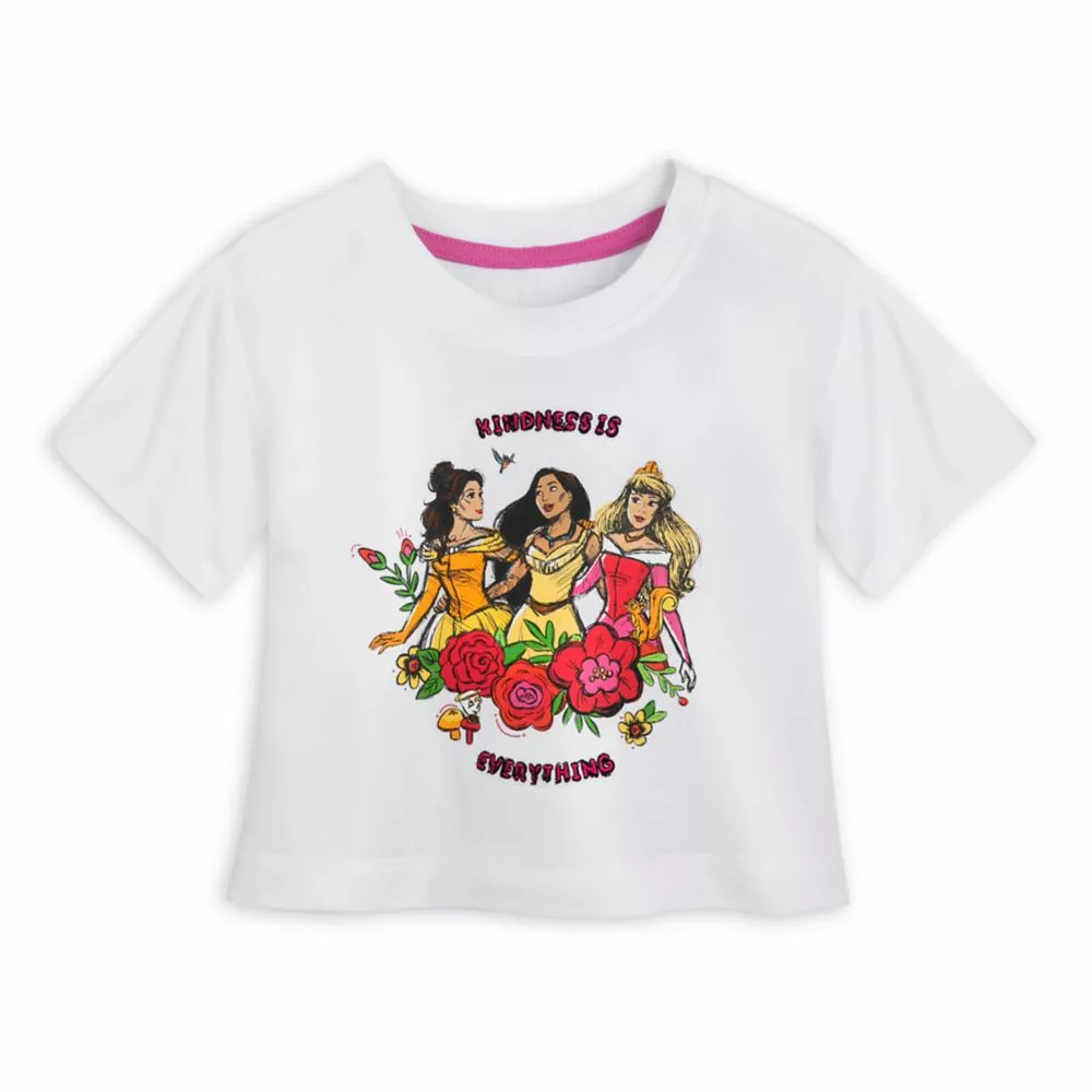 ”Kindness is everything” as exhibited by Aurora, Belle and Pocahontas on this knit top with short drapey sleeves and scoop neckline. The three Disney Princesses are pictured locking arms on this tee that’s made with 70% bamboo so it’s sure to grow on you.