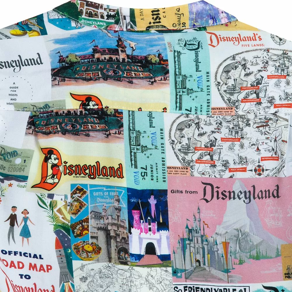 A nostalgic collage of vintage Disneyland print media makes a magical impression on this woven button front camp shirt with collar and chest pocket. It’s a dapper look for any Disney day!