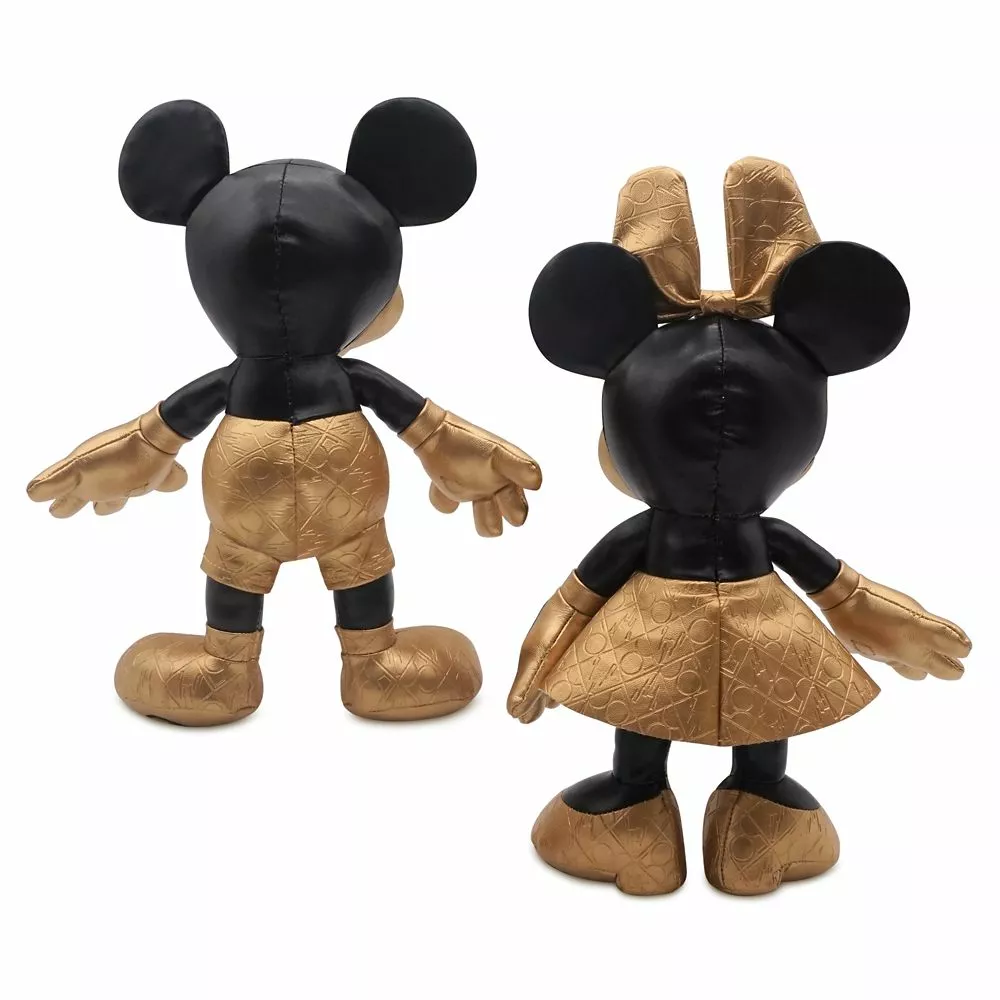 Mickey and Minnie are dressed in their best and ready to celebrate 50 years of Walt Disney World! This plush pair are constructed of gold faux leather and black satin for a luxe set of party pals.