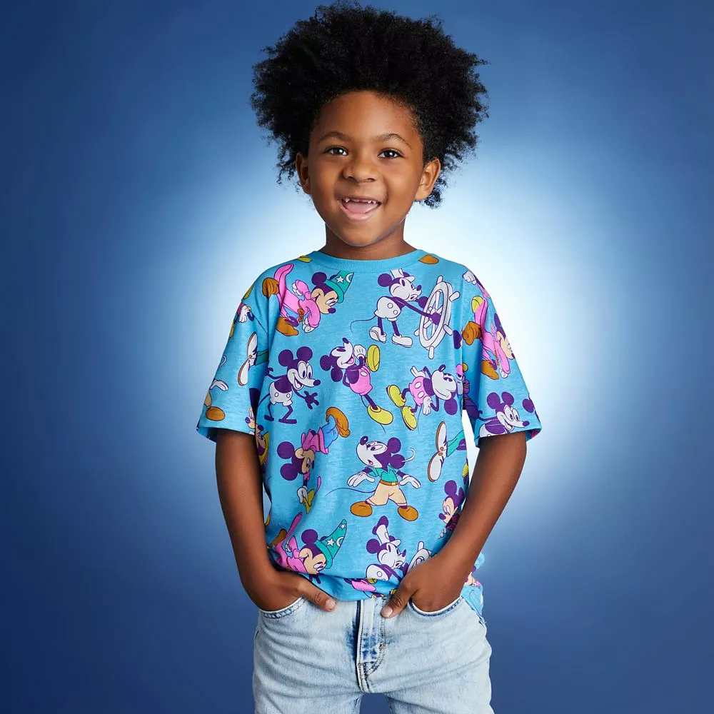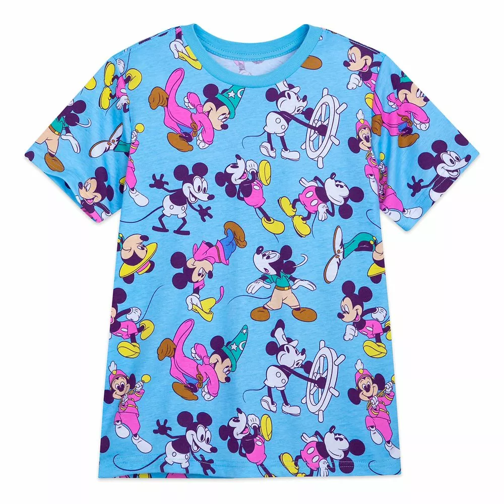 Mickey’s many movie, TV and comics roles get top billing on this jersey knit tee. The colorful allover print features Mickey in some of his most memorable films includingΒ Steamboat Willie, Fantasia, and many more!