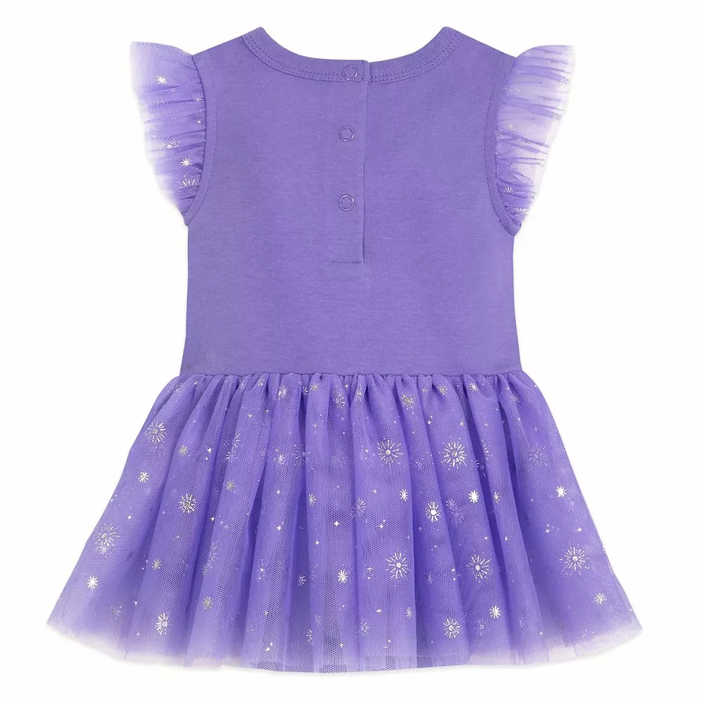 Baby will look dazzling and adorable in this fun dress. The purple frock features glittering Minnie Mouse screen art against a deco design, and tulle sleeves and skirts with a shiny firework print.