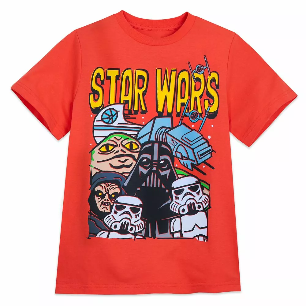 They can join the bright side when wearing this bold orange Star Wars t-shirt featuring a fun illustration. Darth Vader, Jabba the Hutt and Darth Sidious are among the characters pictured along with some TIE starfighters and an AT-AT.