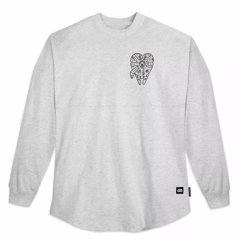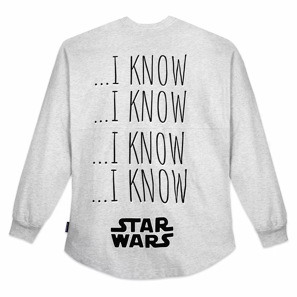 Romance conquers the Star Wars galaxy with this pullover Spirit JerseyΒ featuring a heart-shaped Millennium Falcon on the front and Han Solo’s famous retort, ”…I know” on the back. Look for the companion quote Spirit Jersey sold separately.