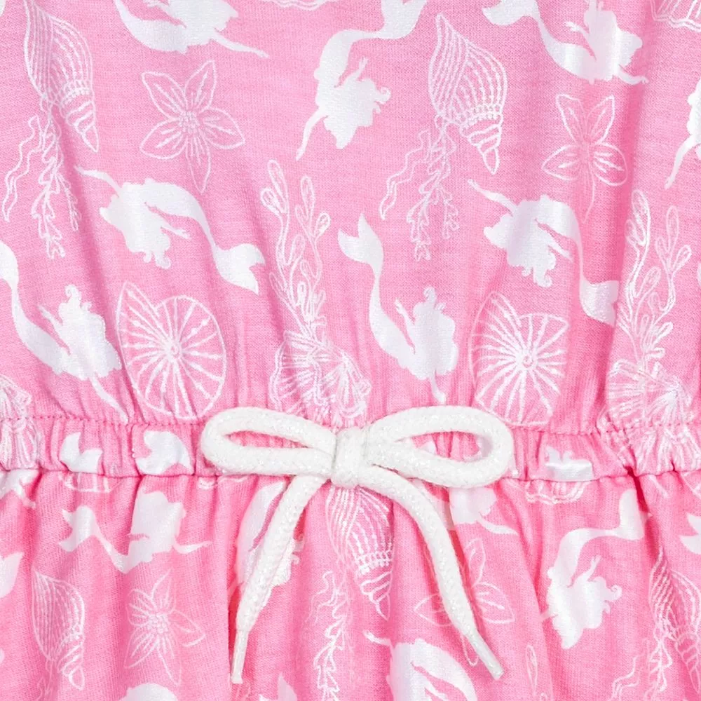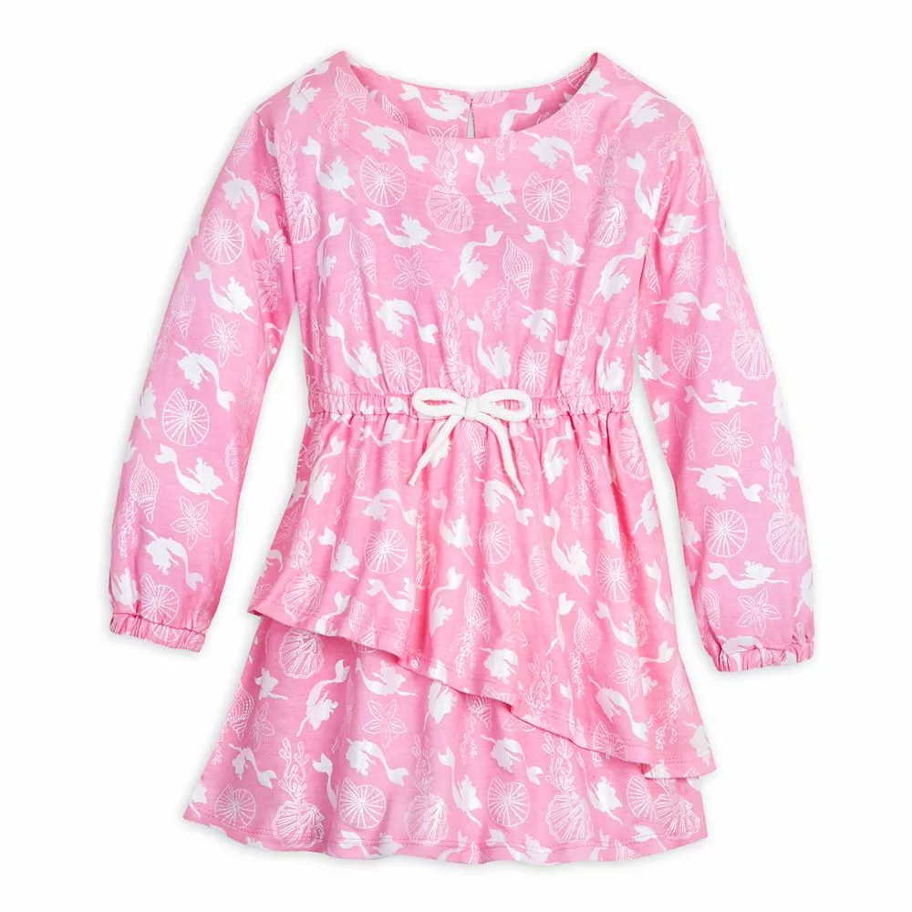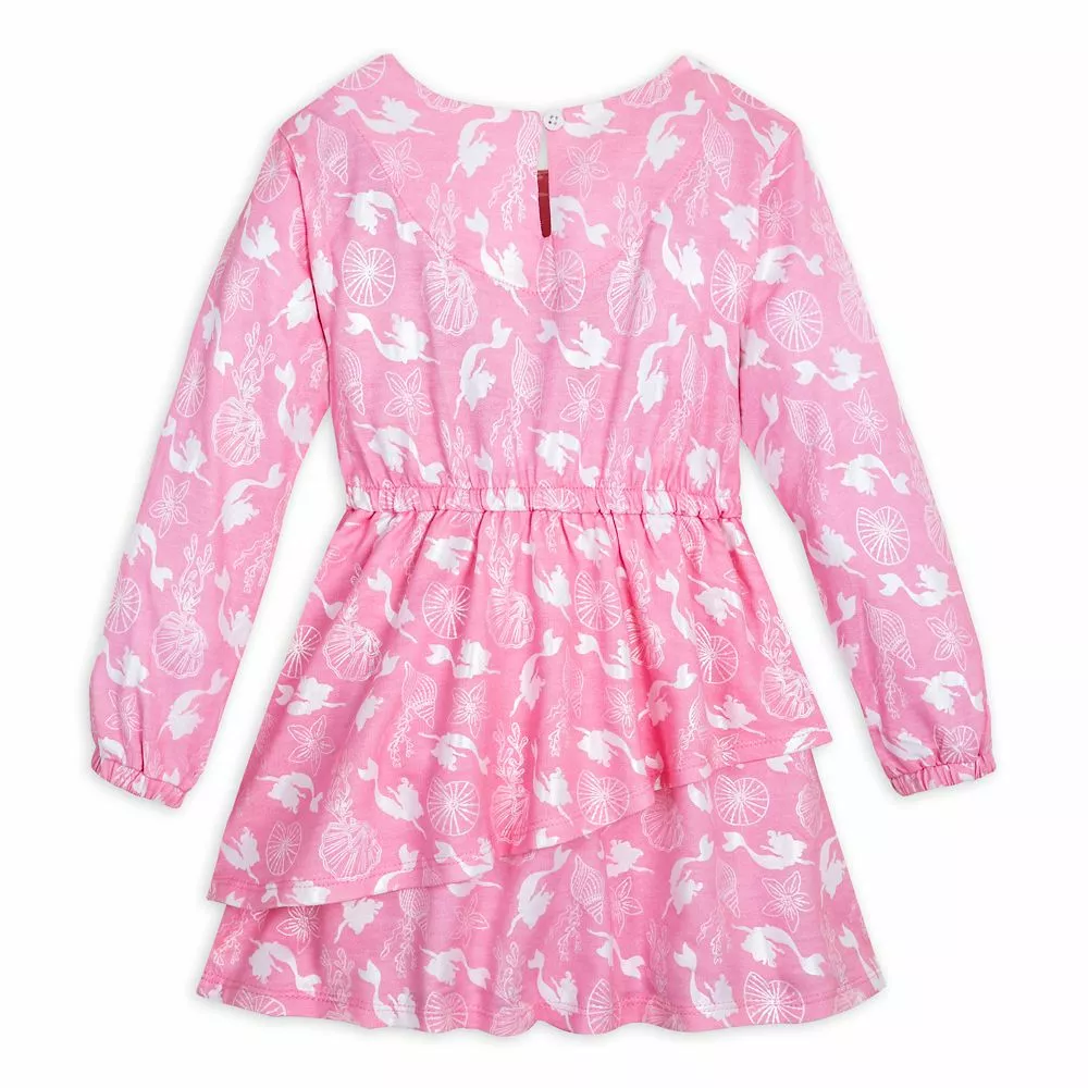 After a fun day swimmin’, bright young things can party at the palace in this lovely Little Mermaid knit dress.Β Ariel silhouettes and seashells make a pretty print pattern on this dress that features dropped shoulders, ruffled sleeve trims and a layered skirt with an overlay cut on the bias.