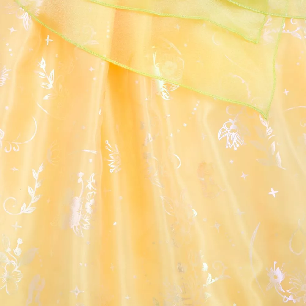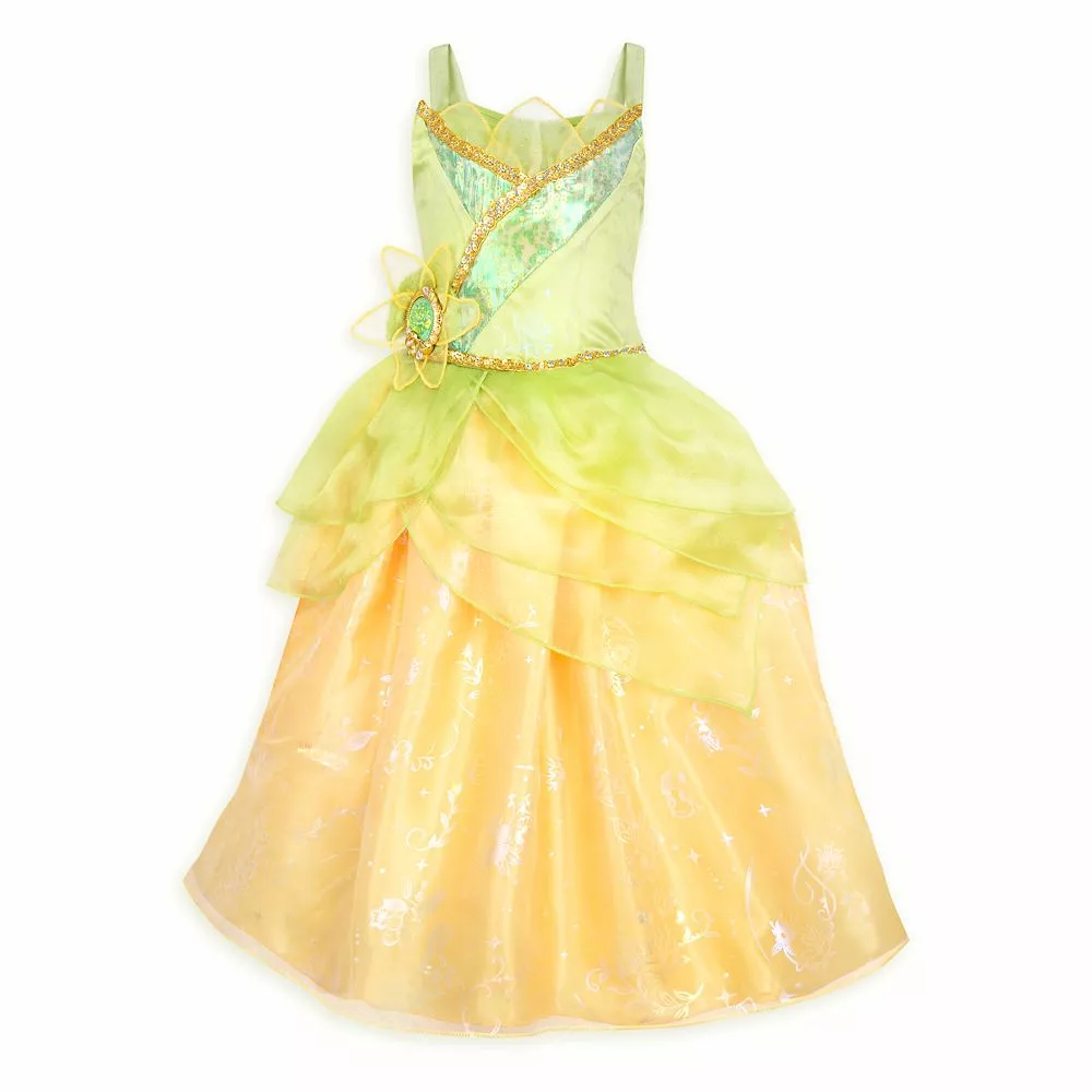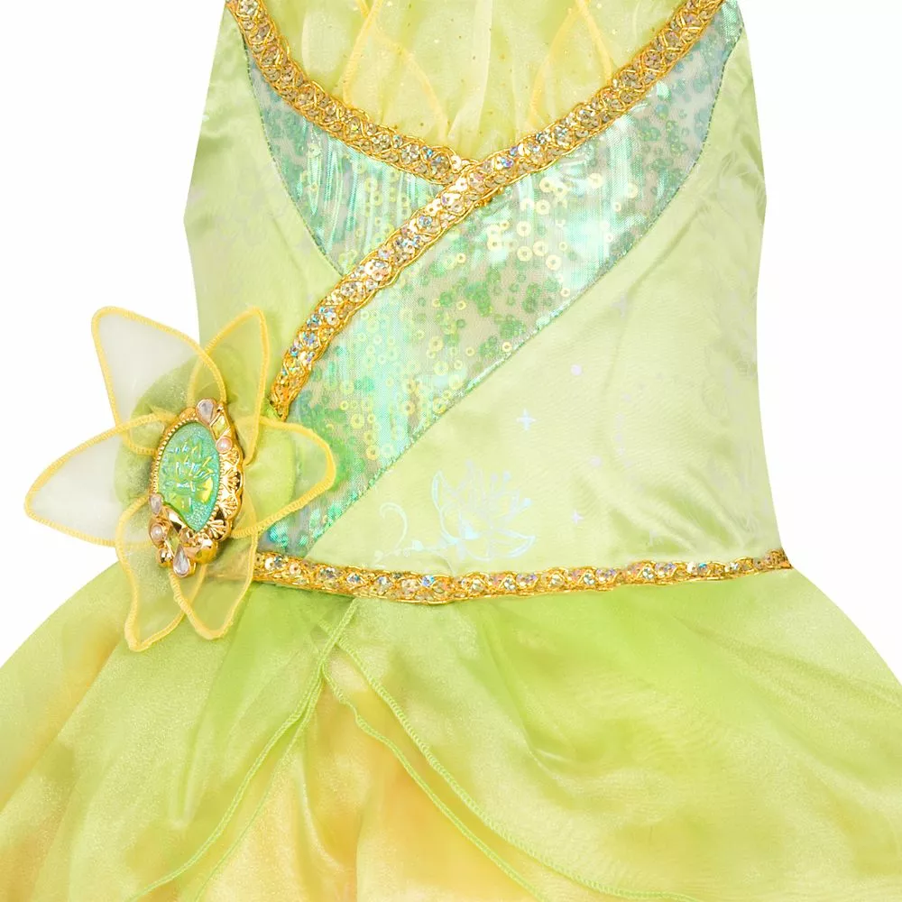 Your masquerade princess will be crowned Queen of the Carnivale in this tiered Tiana Deluxe Costume. Green mesh petals shimmer with metallic flecks and glowing filigree, as a floral appliquΓ© and gem-studded lotus brooch lend a kiss of enchantment to the look.