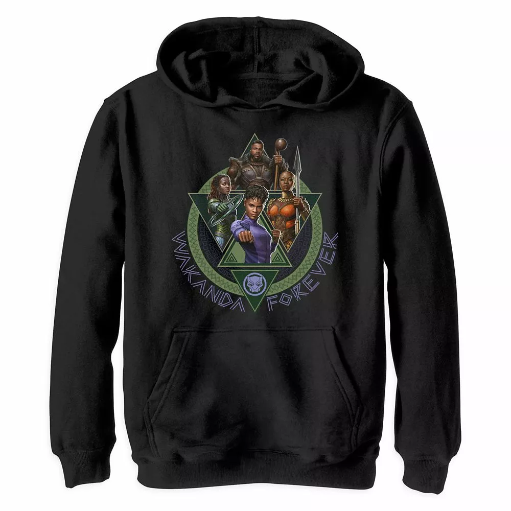 They’ll stand with their favorite heroes in this Wakanda Forever pullover hoodie featuring realistic screen art of Shuri, Nakia, Okoye and M’Baku. Your child will love the fierce artwork and the soft feel of this hooded sweatshirt inspired by Black Panther: Wakanda Forever. After all, it’s made with the next great generation in mind.