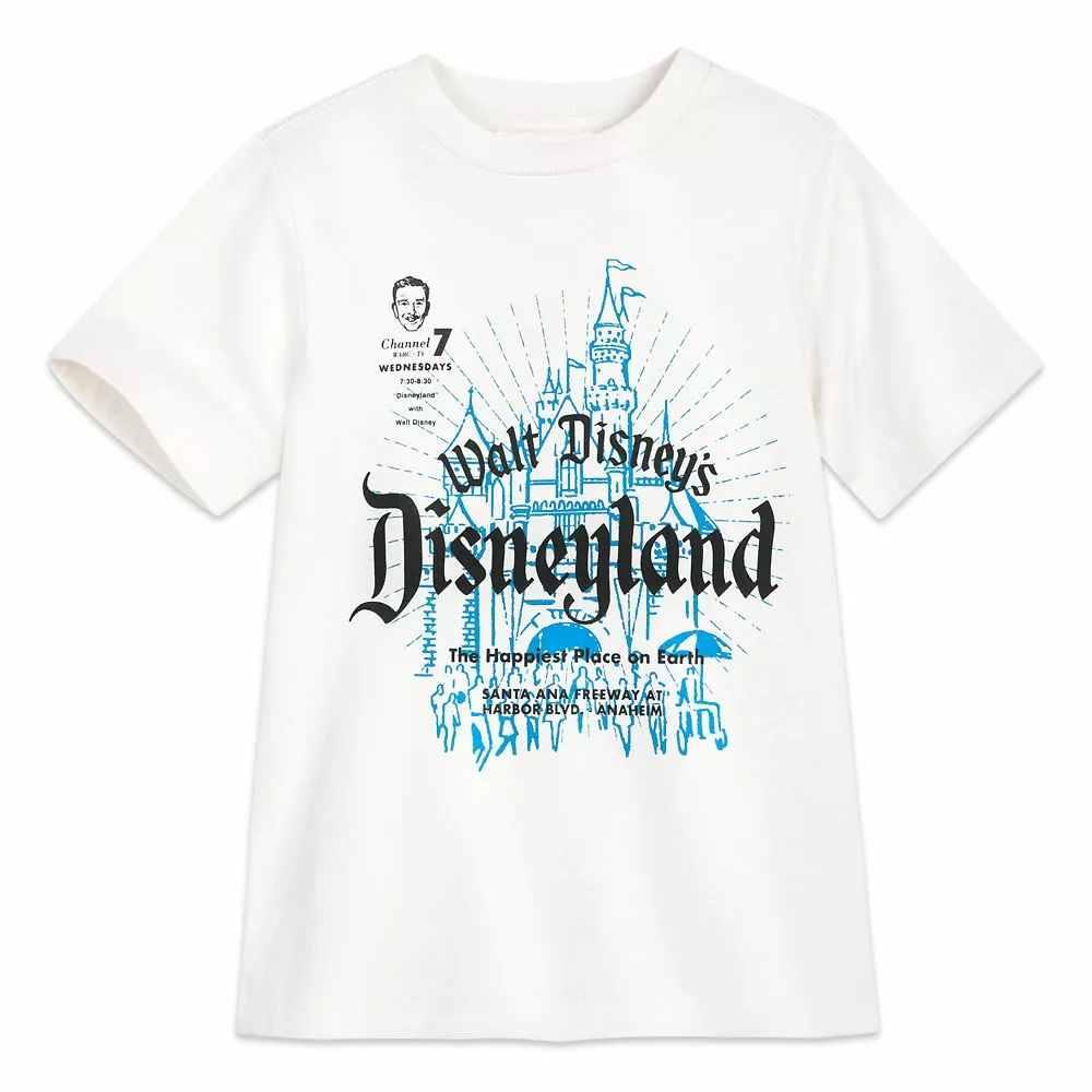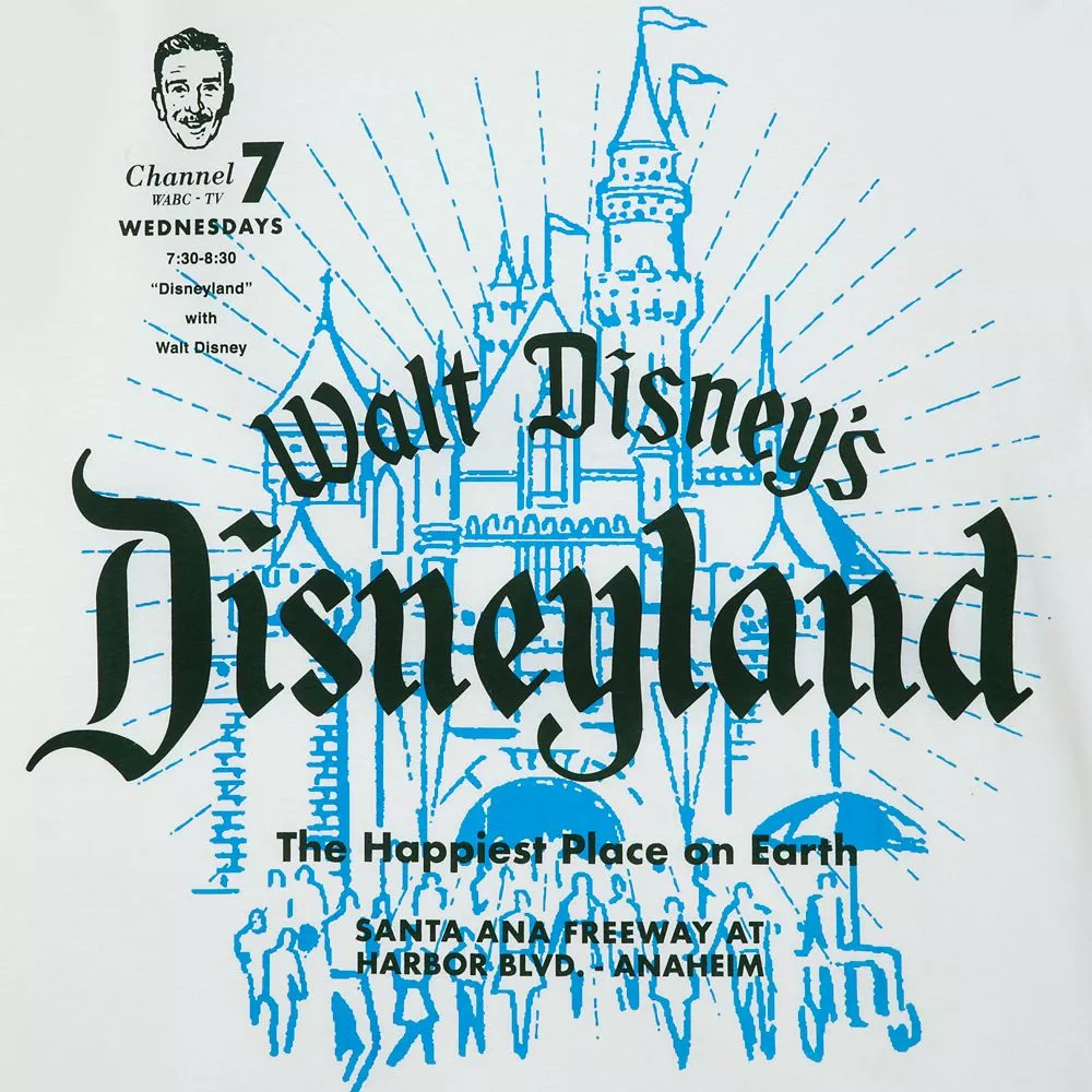 Vintage advertising art presents Walt Disney’s Disneyland, both the park in Anaheim–and the television series on ABC. Wearing this nostalgic jersey tee is a virtual trip to The Happiest Place on Earth for Disneylanders of all generations.