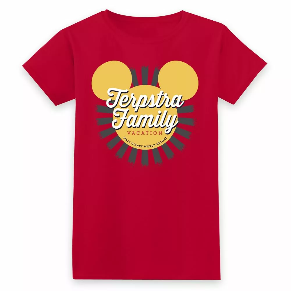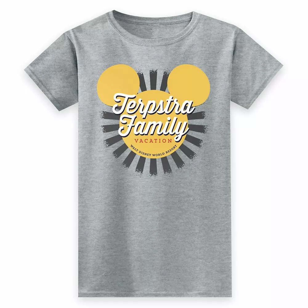 Add a personal touch to your trip down Main Street in this Walt Disney World t-shirt. Available in a choice of colors, it features Mickey’s stylized silhouette paired with a personalized name, lending a familial flair to any Disney Parks adventure!